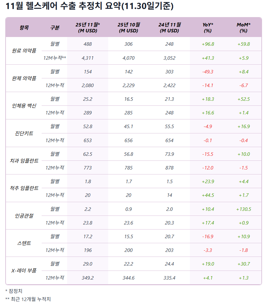 2025년 11월 헬스케어 수출 추정(월말 잠정) – 원료의약품 급증, 완제 부진, 백신·진단키트 회복, 척추 임플란트 성장, 치과 임플란트·스텐트 약세.